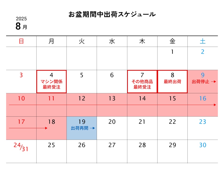 お盆期間中の出荷スケジュールは下記の通りです。
