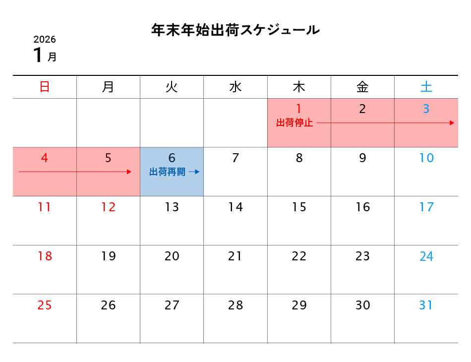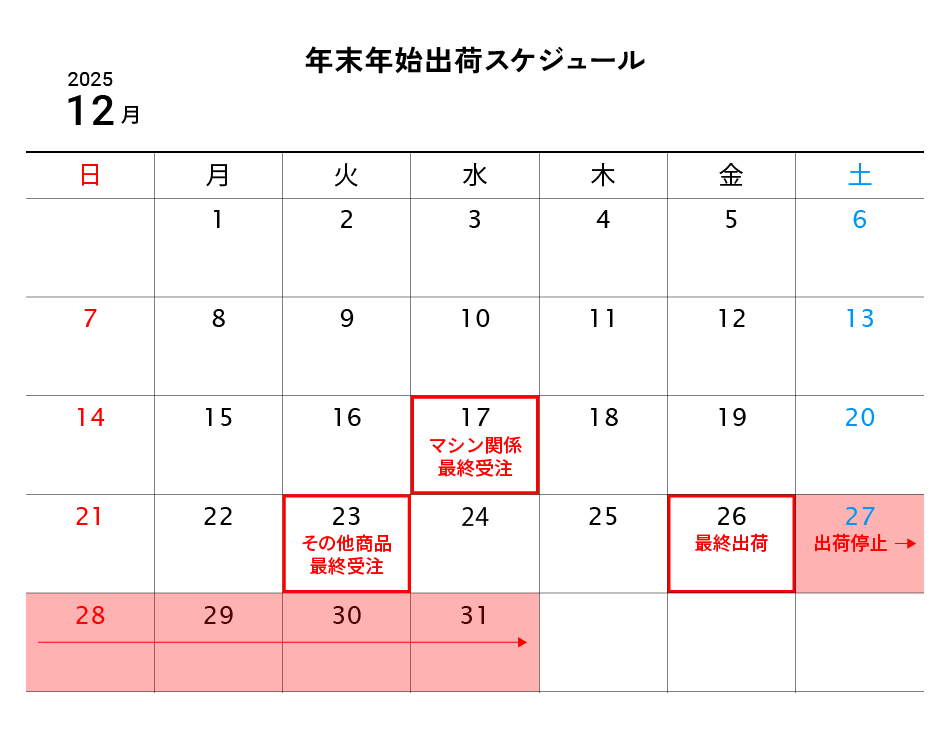 年末年始の出荷スケジュールは下記の通りです。